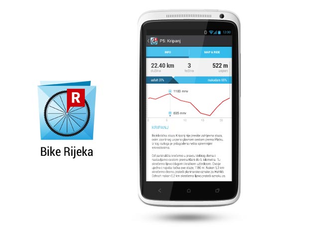 Mobilna aplikacija Bike Rijeka omogućava pretraživanje četrdesetak staza prikazanih na Google karti i navigaciju njima. Staze je moguće birati prema težini, dužini, lokaciji, ili atrakcijama koje se uz nju nalaze. Tu su i opisi atrakcija, najbliža okrepa, servis, smještaj… Sve što biciklistu treba za istraživanje novih staza.