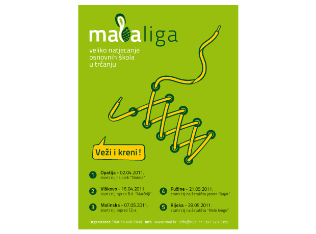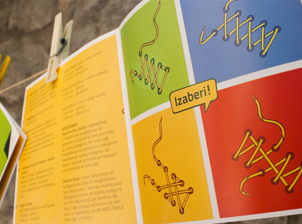 Slogan ovogodišnje Lige je “Veži i kreni” čime smo potaknuli djecu na aktivnost i domišljatost. Osim osmišljavanja slogana dizajnirali smo novi logotip te sve popratne promotivne materijale od zgodnih majica, neizostavnih plakata, ciljnog luka, banera i edukativne brošure. Zaigrali smo se zajedno s djecom te ih naučili o različitim načinima vezivanja vezica.